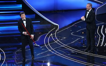 Sanremo 2023, Gianni Morandi con la scopa scherza sul caso Blanco