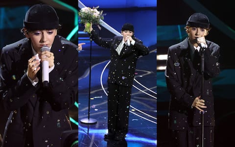 Il guardaroba di Lazza è stato un percorso studiato attraverso creazioni che, ogni sera, hanno aggiunto un po' di significato al brano in gara. Dalla cenere, la fenice risorge fiammeggiante. Più che logico, allora, concludere con un completo rosso fuoco, bellissimo nella trama Missoni. Voto: 7.5