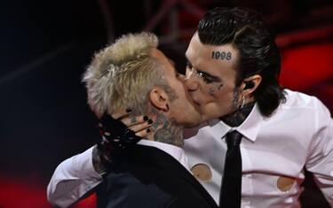 Il bacio in bocca tra Rosa Chemical e Fedez a Sanremo 2023. FOTO
