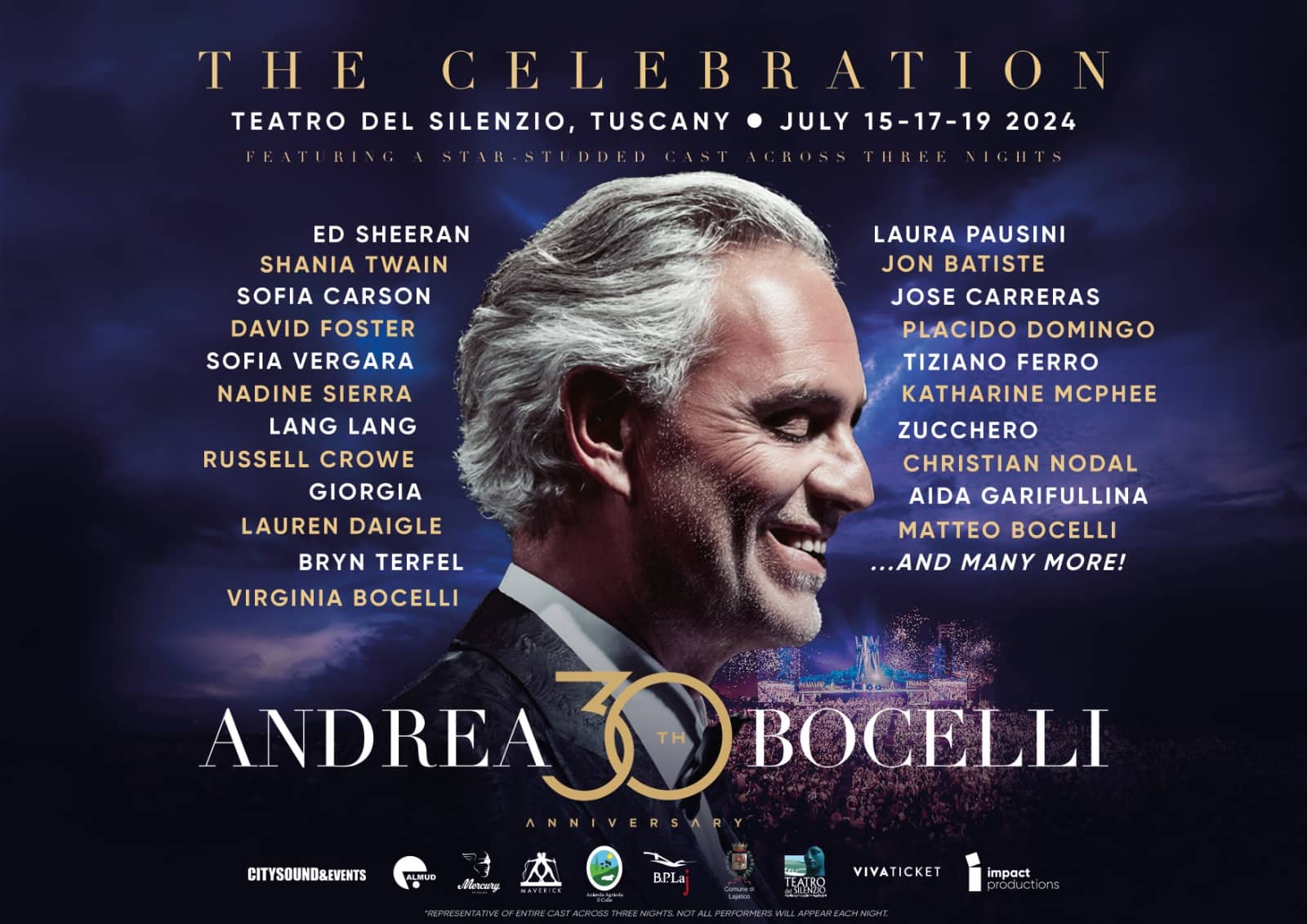Sul palco del Teatro del Silenzio, saliranno Ed Sheeran, Jon Batiste, Russell Crowe, Shania Twain, Sofia Vergara, David Foster, Christian Nodal, Sofia Carson, Laura Pausini, Tiziano Ferro, Zucchero, Giorgia, Matteo Bocelli, Virginia Bocelli e, ancora, le stelle della musica classica Plácido Domingo, José Carreras, Lang Lang, Aida Garifullina, Bryn Terfel, Nadine Sierra. "Da bambino ho imparato a sognare il mio futuro nel silenzio incantato di queste colline. Voglio ringraziare tutti coloro che hanno aiutato i miei sogni d'infanzia a diventare realtà con un concerto indimenticabile”, ha detto Andrea Bocelli.