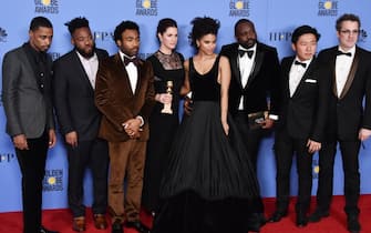 Il cast artistico e tecnico di Atlanta posa con il Golden Globe vinto per la categoria "Miglior serie comedy o musical"