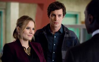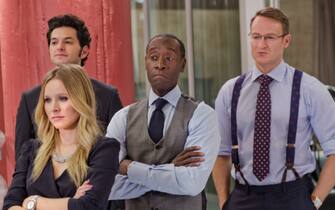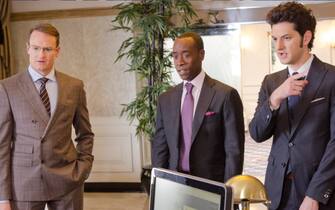 Il cast di House of Lies. Da sinistra a destra, Kristen Bell (Jeannie Van Der Hooven), Don Cheadle (Marty Kaan), Josh Lawson (Doug Guggenheim) e Ben Schwartz (Clyde Oberholt) - © Showtime Networks Inc. All rights reserved.