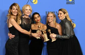 Laura Dern, Nicole Kidman, Zoe Kravitz, Reese Witherspoon e Shailene Woodley in posa per l'edizione 2018 dei Golden Globe Awards, che hanno visto trionfare Big Little Lies