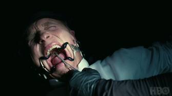 "Sono nata in questo mondo..." dice Dolores in voice over, e intanto vediamo proprio i personaggi di Evan Rachel Wood e di Aaron Paul (che si chiama Caleb) insieme, in una stanza vuota, tranne per una sorta di sarcofago/contenitore. E' da lì che arriva Dolores, che, tra l'altro, si trova dentro un corpo che consiste solamente (testa a parte) nella struttura metallica e nelle parti idrauliche atte al movimento?