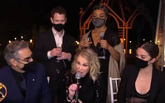 Collegata da casa, Catherine O'Hara che ritira il premio come Miglior attrice di una serie comedy per Schitt's Creek
