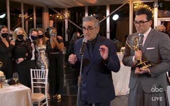 Eugene e Dan Levy, padre e figlio entrambi protagonisti di Schitt's Creek, durante la cerimonia "in remoto" che ha visto lo show aggiudicarsi il premio come Miglior serie comedy, assieme a una serie di altri prestigiosi riconoscimenti