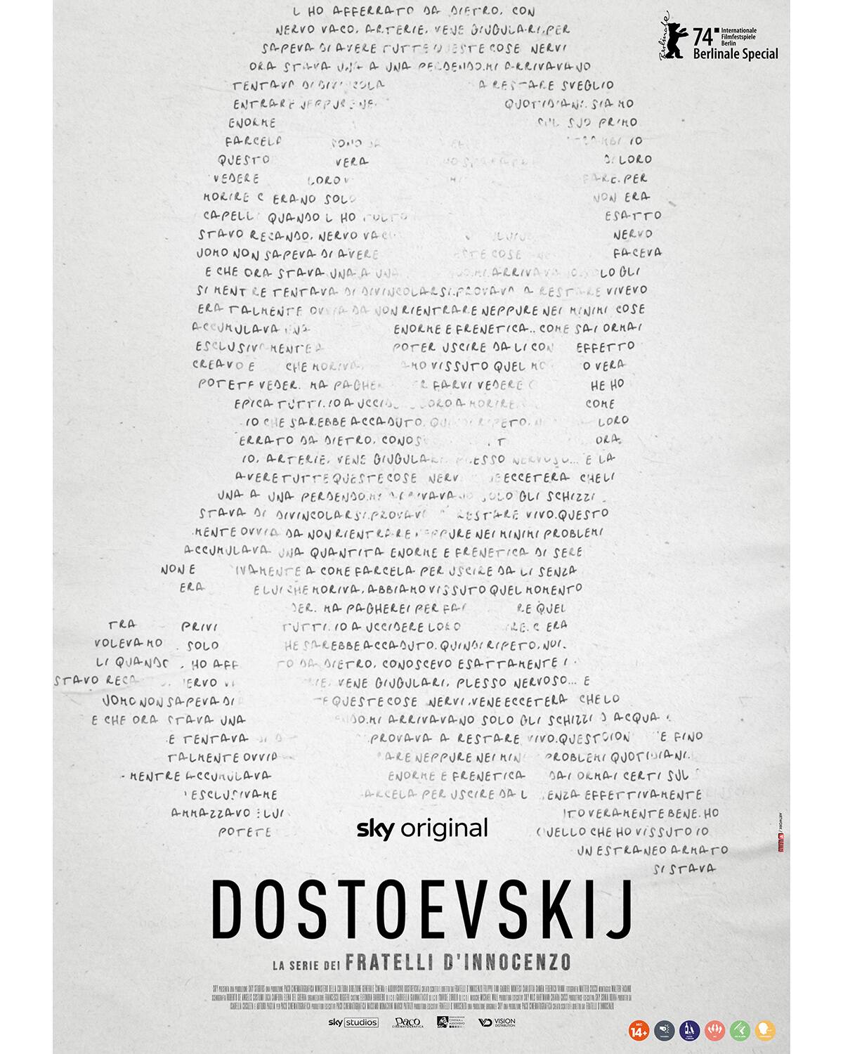 Rilasciato oggi il poster ufficiale di Dostoevskij, la serie Sky Original ideata, scritta e diretta dai Fratelli D’Innocenzo, che sarà presentata in anteprima mondiale alla 74ª edizione del Festival Internazionale del Cinema di Berlino, nella sezione Berlinale Special. La serie arriverà prossimamente al cinema con Vision Distribution.