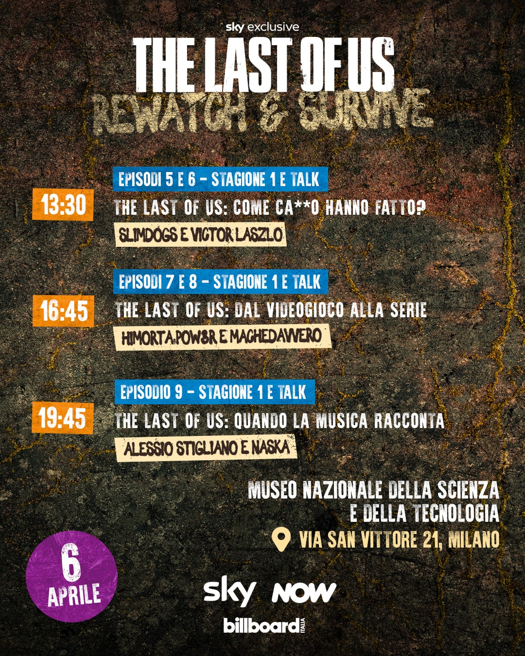 Sabato 5 e domenica 6 aprile a Milano, presso il Museo Nazionale Scienza e Tecnologia Leonardo da Vinci (via San Vittore 21 ), l’evento THE LAST OF US – REWATCH & SURVIVE permetterà di rivivere, grazie a un programma fittissimo di appuntamenti, tutte le emozioni di un primo ciclo di episodi da record, riuscito nell’impresa di entusiasmare la critica e i fan del videogioco sviluppato da Naughty Dog, di macinare numeri impressionanti in tutto il mondo e di conquistarsi un fandom fatto anche di milioni di spettatori che mai avevano giocato all’acclamato videogame per PlayStation prima.