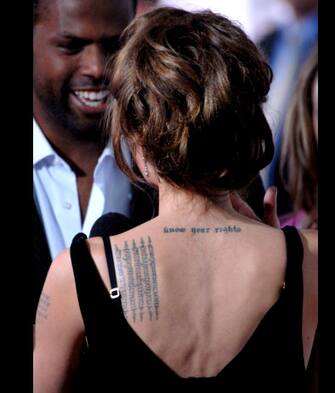 La Jolie, sulla spalla sinistra, ha cinque righe verticali in lingua Khmer per proteggere i suoi figli. Al centro, tra le scapole, è presente la scritta 'know your rights'
