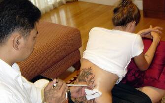 Sulla schiena ha una tigre del Bengala, realizzata a Bangkok con l'antica tecnica Thai che prevede l'utilizzo di una bacchetta alla cui estremità sono fissati aghi o una punta di metallo