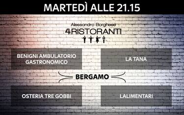 La città doppia: Bergamo Alta arroccata sul Colle, scrigno di gioielli architettonici unici al mondo, sede di musei e pinacoteche, vicoli e negozi antichi, ristoranti caratteristici e botteghe che convive perfettamente con la Città Bassa, al contrario dinamica e imprenditoriale, dove la moda e il design, la vita mondana e l'imprenditoria la fanno da padroni. È proprio in questo scenario che Alessandro Borghese andrà alla scoperta della cucina contemporanea bergamasca. Questa città antica sempre piena di turisti provenienti da tutto il mondo, è la tappa scelta da Alessandro Borghese 4 Ristoranti. Appuntamento come sempre di martedì alle 21.15 su Sky Uno.