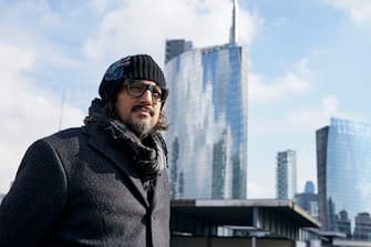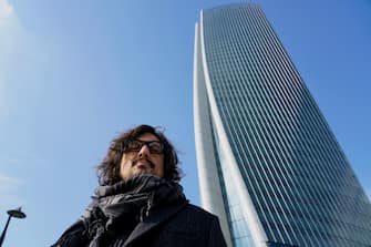 Un bel primo piano di Alessandro Borghese sullo sfondo del grattacielo dell'Unicredit in zona Gae Aulenti/Garibaldi