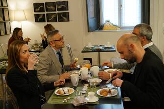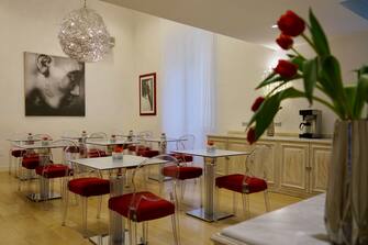 All’ingresso vi è una hall con divanetti e poltroncine, molto elegante e confortevole, sula destra si apre la sala colazioni che durante il giorno è allestita con tavolini a disposizione dei clienti.