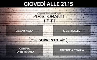 Nella terza puntata Alessandro Borghese si reca a Sorrento alla ricerca del miglior ristorante di cucina di terra e di mare. Nelle puntate successive Alessandro Borghese 4 Ristoranti fa tappa in altre affascinanti località di villeggiatura d’Italia: Padova, Sardegna e Parco del Pollino.
