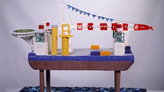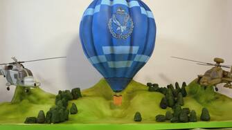 Una torta a forma di mongolfiera con annessi due elicotteri e un parco