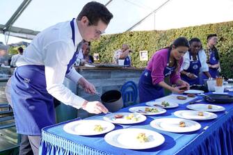 I concorrenti della squadra blu collaborano alla preparazione dei loro piatti.