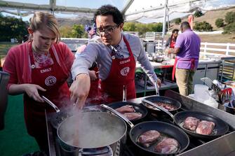 I concorrenti della squadra rossa si organizzano per la preparazione dei loro piatti.