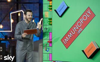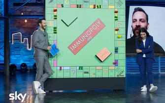 Imen Jane e Alessandro Cattelan accanto al tabellone di Immunopoly. EPCC vi aspetta tutti i martedì alle 21.15 su Sky Uno (canale 108) e su digitale terrestre al canale 455