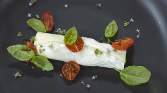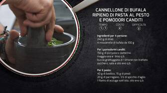 Un primo piatto pensato per i più piccoli: il cannellone di bufala ripieno di pasta al pesto e pomodori candidi