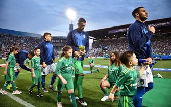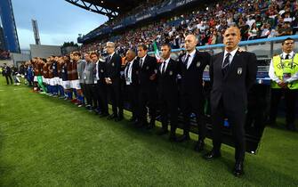 Gli Azzurrini, guidati dal ct Di Biagio, durante l'esecuzione dell'inno