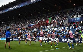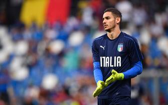 Il portiere degli Azzurrini Meret durante il riscaldamento prima di Italia-Belgio