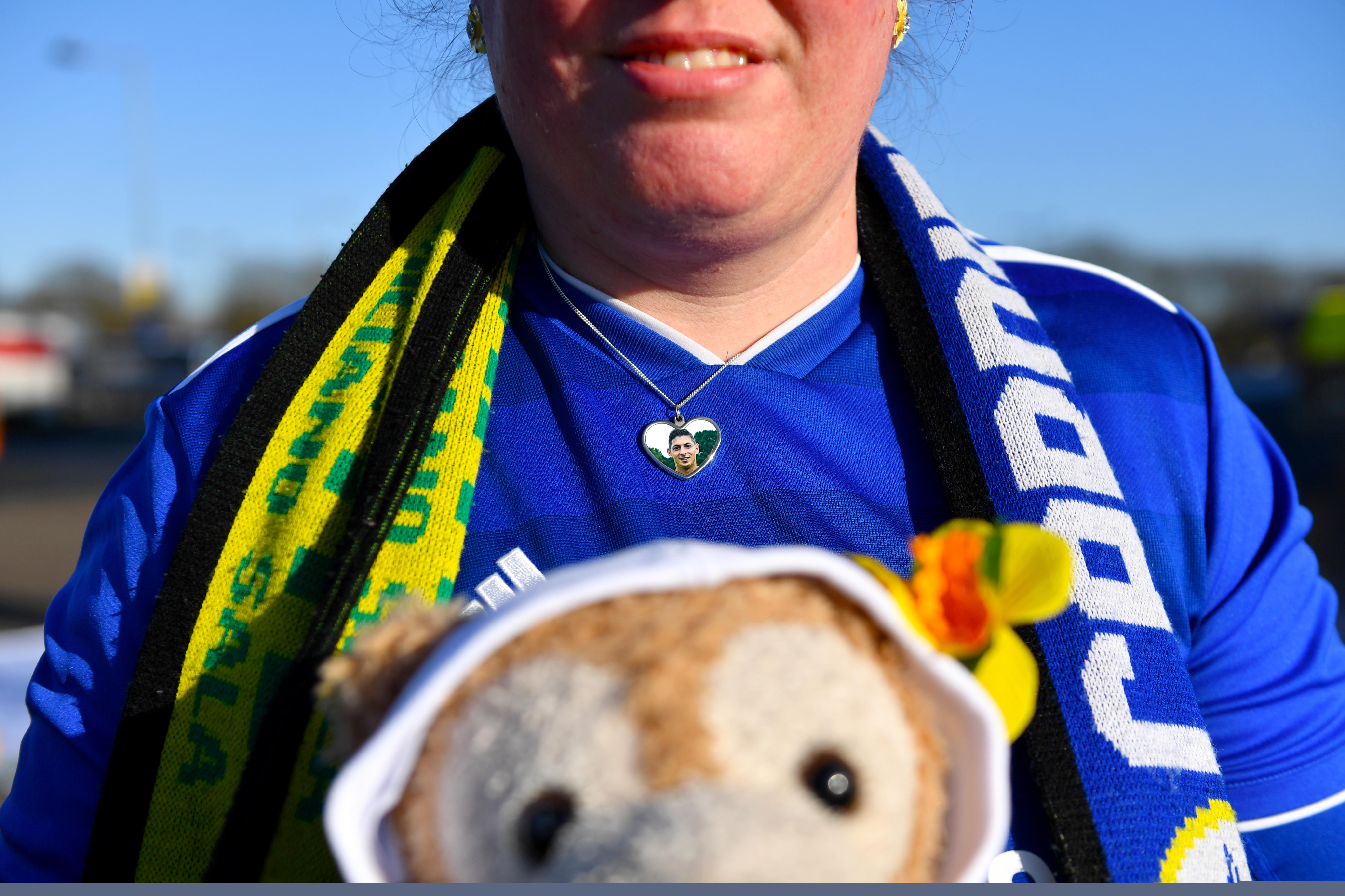 Una tifosa del Cardiff indossa una collana con l'immagine di Emiliano Sala all'esterno dello stadio, in occasione del tributo al calciatore ad un anno dalla sua scomparsa
