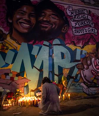 Sotto i volti sorridenti di Kobe e Gianna Bryant i passanti continuano a mettere doni e candele in loro onore