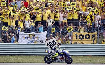 Ma il digiuno finirà nel 2008 quando il campione di Tavullia salirà nuovamente sul tetto del mondo. Nella foto Rossi celebra la sua centesima vittoria in carriera al Gran Premio d'Olanda del 2009