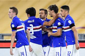 I giocatori della Sampdoria festeggiano il gol del vantaggio contro la Roma
