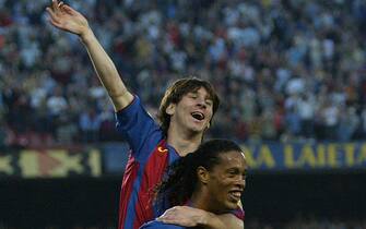 Il primo dei 630 gol in blaugrana Messi lo ha realizzato il primo maggio del 2005 quando il talento di Rosario, su perfetto assist di Ronaldinho (nella foto), superò l'estremo difensore dell'Albacete con un chirurgico pallonetto