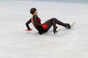 La pattinatrice russa di 15 anni ha completamente sbagliato, forse per tutta la tensione accumulata in questi ultimi giorni a seguito della positività al doping, il programma libero