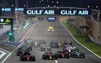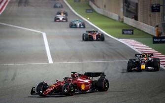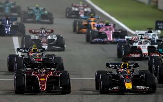 Un momento del duello alla partenza in Bahrain tra la Ferrari di Leclerc e la Red Bull di Verstappen