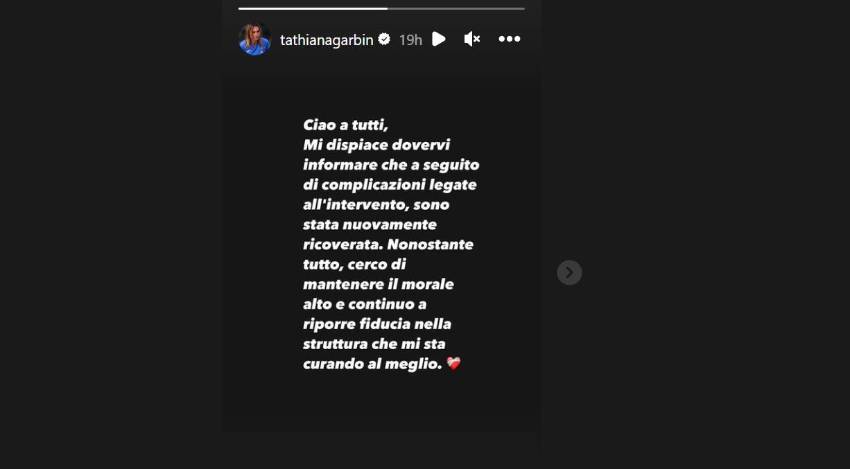 "Ciao a tutti, mi dispiace dovervi informare che a seguito di complicazioni legate all'intervento, sono stata nuovamente ricoverata. Nonostante tutto, cerco di mantenere il morale alto e continuo a riporre fiducia nella struttura che mi sta curando al meglio". Questo il post di Tathiana Garbin che dopo essere stata dimessa quattro giorni fa, è costretta nuovamente al ricovero in ospedale in seguito a complicanze sopravvenute dopo l'operazione del 27 novembre scorso.