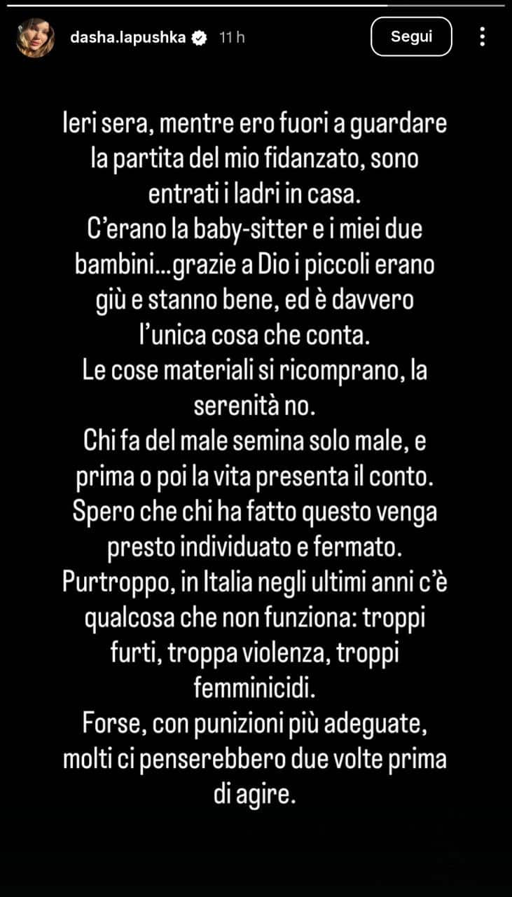 Nel comunicare il furto, la stessa compagna di Pinamonti si è sfogata. "Sono entrati i ladri mentre ero guardare la partita del mio fidanzato - le parole di Lapushka -. Dentro c'erano i miei bimbi con la baby sitter: grazie a Dio i piccoli erano al piano di sotto e stanno bene e quella è l'unica cosa che conta. Le cose materiali si ricomprano, la serenità no. Chi fa del male semina solo male e prima o poi la vita presenta il conto", ha scritto. "Spero che chi ha fatto questo venga presto individuato e fermato: purtroppo in Italia, negli ultimi anni c'è qualcosa che non funziona, troppi furti, troppa violenza, troppi femminicidi. Forse, con più punizioni adeguate, molti ci penserebbero due volte prima di agire". Dopo l'accaduto, a casa del bomber del Sassuolo sono intervenute le volanti della polizia di Stato.