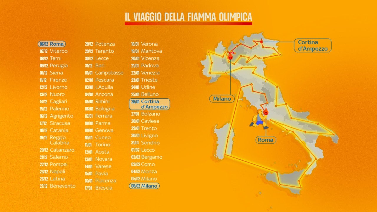 Il 26 novembre, da Olimpia, in Grecia, è iniziato il viaggio della Fiamma Olimpica di Milano- Cortina 2026. Prima tappa in Italia domani 4 dicembre a Roma, poi partirà verso le 110 province della Penisola: dal Sud al Nord, passando prima di Natale dalla Sardegna alla Sicilia, per poi risalire lungo la costa tirrenica in Calabria e Campania e scendere di nuovo nel Meridione, questa volta sul versante adriatico, in Puglia ed arrivare il primo giorno del 2026 a Campobasso. Poi il cammino proseguirà verso il Nord, passando per il Centro Italia, fino ad arrivare a Cortina d’Ampezzo il 26 gennaio e proseguire il cammino fino a Milano, dove arriverà per la cerimonia di apertura del 6 febbraio.