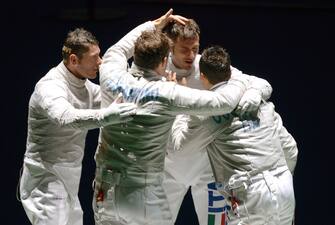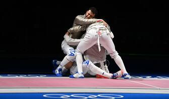 "In finale alla mia quinta Olimpiade, meglio di così non si può", ha detto Montano dopo aver raggiunto la sfida per l'oro. E ha aggiunto: "Quasi quasi resto fino a Parigi 2024, magari anche come armiere...". Nella foto: la squadra dopo la qualificazione per la finale