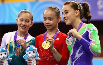 Nata a Catania nel 1995, inizia a muovere i primi passi nel mondo della ginnastica già da giovanissima. Ad appena 8 anni, entra nella società La Salle Gym di Acireale e arrivano anche le prime convocazioni nella nazionale juniores. Nella foto Angela Donald, medaglia di bronzo per l'Australia, Sixin Tan oro della Cina e Carlotta Ferlito, argento nella trave ai Giochi Olimpici giovanili di Singapore del 2010