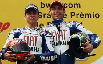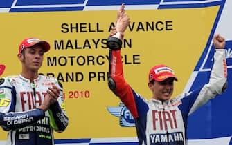 Col terzo posto, nel Gp di Malesia, il 10 ottobre 2010, Lorenzo si laurea per la prima volta campione del mondo in Moto Gp. Rossi qui sul podio a Sepang, con il compagno della Yamaha, sarà terzo a fine stagione nella classifica generale