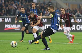 Il 15 ottobre del 2017 Icardi segna una storica tripletta nel derby contro il Milan. L'Inter, grazie ai gol dell'attaccante argentino, si impone per 3 a 2 sui cugini rossoneri. Nella foto Icardi firma su rigore la rete della vittoria