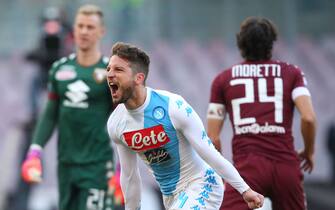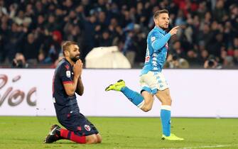Mertens chiuderà la stagione d'esordio da prima punta con uno score di 34 gol in 46 presenze tra campionato e coppe. Nella foto Mertens esulta per il gol del definitivo 3 a 2 inflitto al Bologna il 29 dicembre del 2018. I Rossoblu, peraltro, sono la vittima preferita dell'attaccante belga che al Bologna ha fatto 11 gol in sei partite