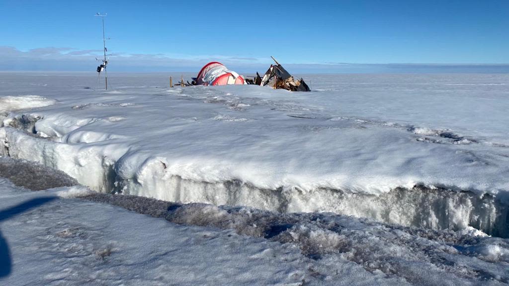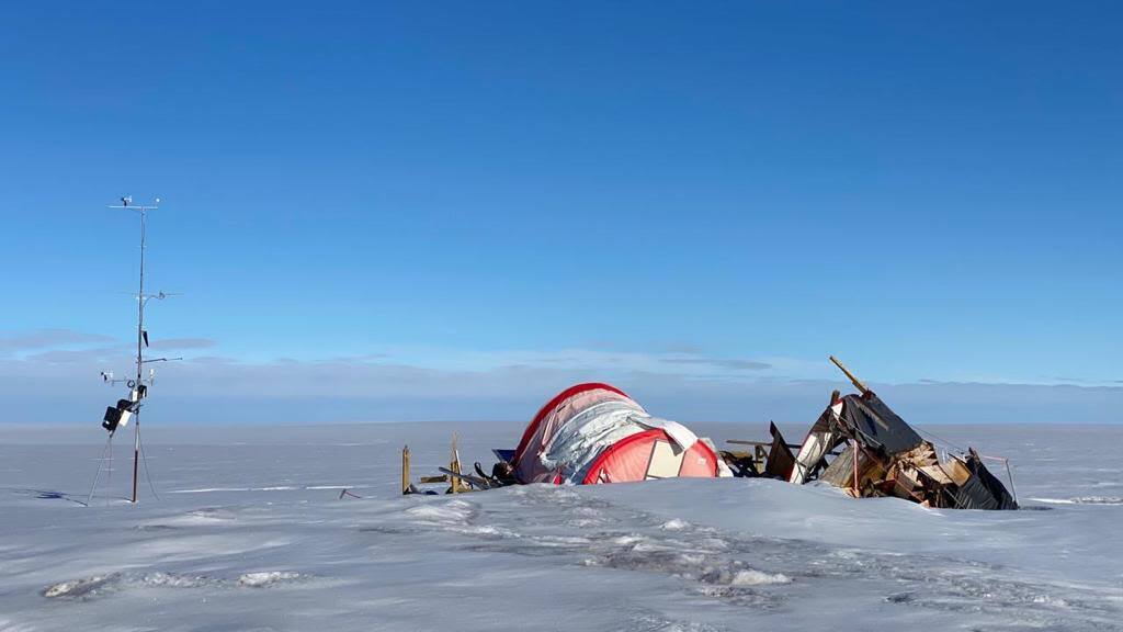 La piattaforma era collassata. Poggiata a mo' di palafitta su pali conficcati in profondità nel ghiaccio, aveva ceduto. I crepacci avevano iniziato a ingoiare i materiali che Koni aveva lasciato là per l'inverno.