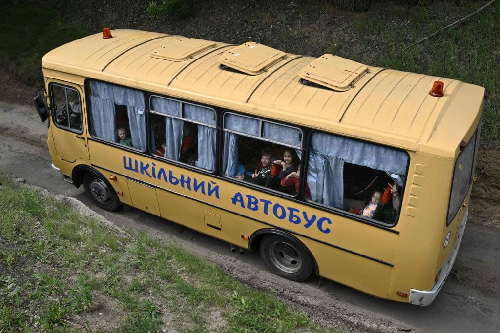 Un comune autobus cittadino di Kyiv ci viene incontro. Blu e giallo. Un autobus di soccorso.