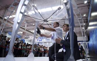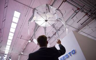 Nell'edizione 2017 della World Robot Conference sono coinvolti oltre 300 specialisti, 150 imprese e 15 organizzazioni globali di punta. Nella foto, un oggetto volante sviluppato dalla Festo attira l'attenzione -