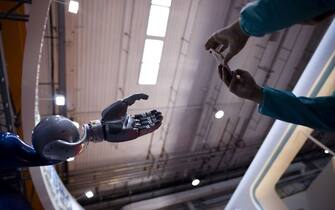 Il pubblico è spinto ad entrare a diretto contatto con le creazioni in esposizione. Nell'immagine, un bambino è impegnato a controllare un braccio robotico -