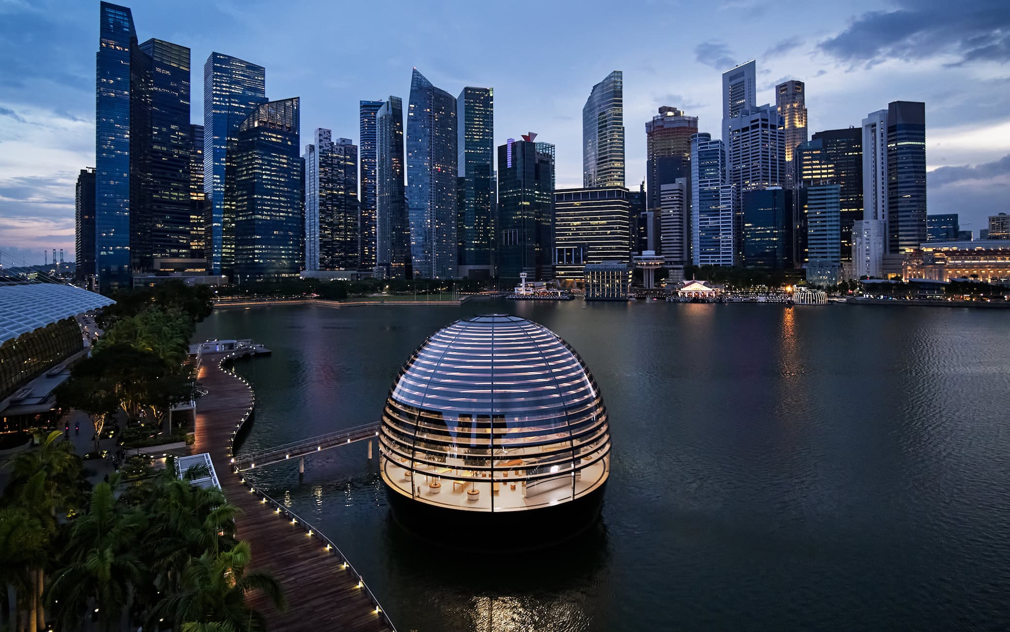 Apple Marina Bay Sands è ispirato al Pantheon di Roma, offre una vista panoramica a 360 gradi della città e del suo spettacolare skyline ed è composto da una struttura a cupola interamente in vetro