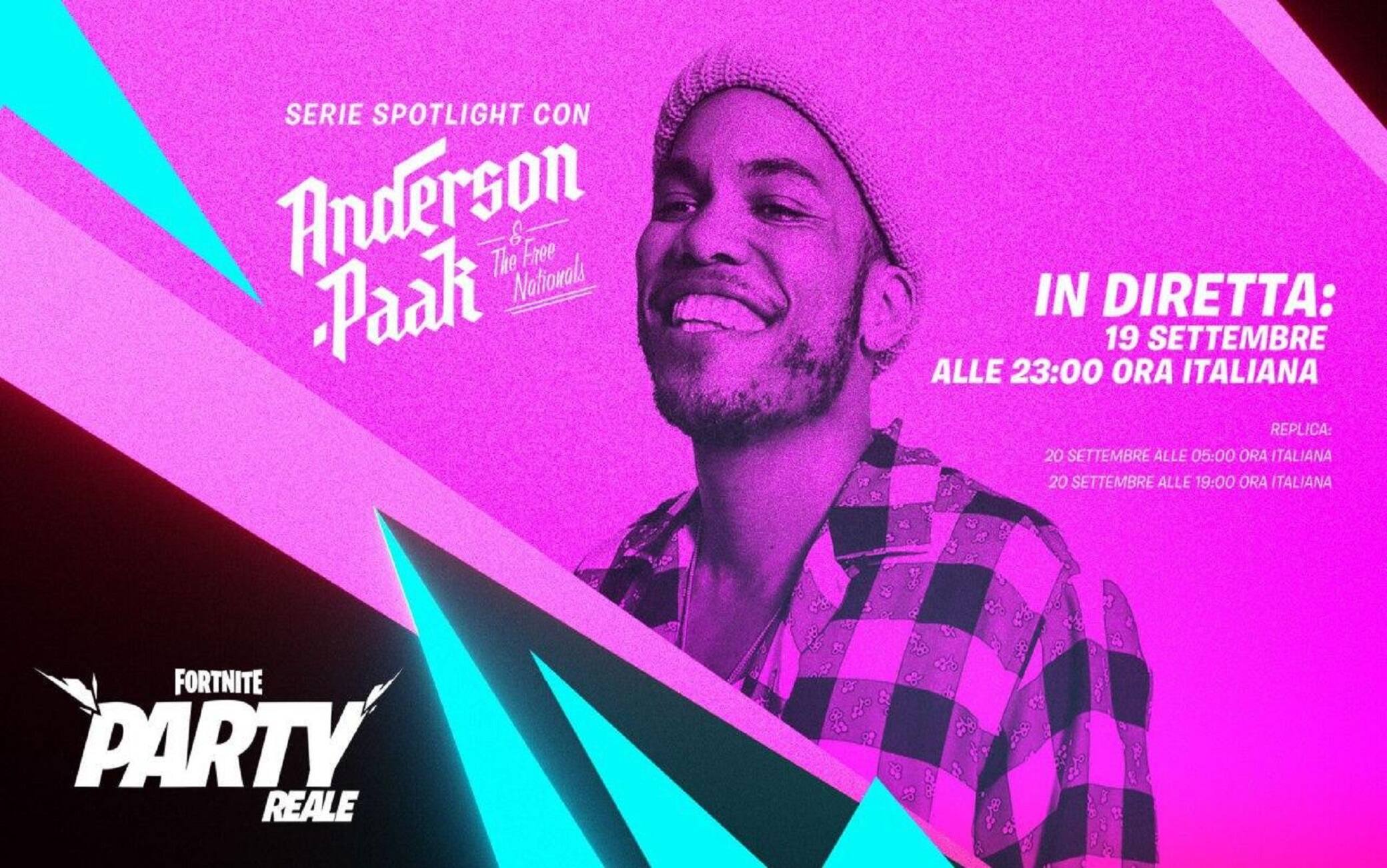 Dopo l’evento in cui è stato protagonista Dominic Fike, cantante, rapper e compositore che il 12 settembre è stato al centro della scena, nella modalità Party Reale di Fortnite, di un evento musicale in live, sarà la volta del talentoso Anderson .Paak. Dopo essere esploso sulle scene nel 2014, .Paak ha conquistato vari premi Grammy, inclusa anche la miglior performance rap nel 2019 con "Bubblin" e il miglior album R&B quest'anno con il suo album di successo, "Ventura". Il nuovo evento, trasmesso come quello di Fike da un nuovo studio di Los Angeles costruito appositamente per i concerti live in-game, è in calendario per sabato 19 settembre. Fa parte, come il primo, della serie di concerti Spotlight che i produttori di Fortnite stanno proponendo ai tantissimi fan nel mondo del celebre battle royale.