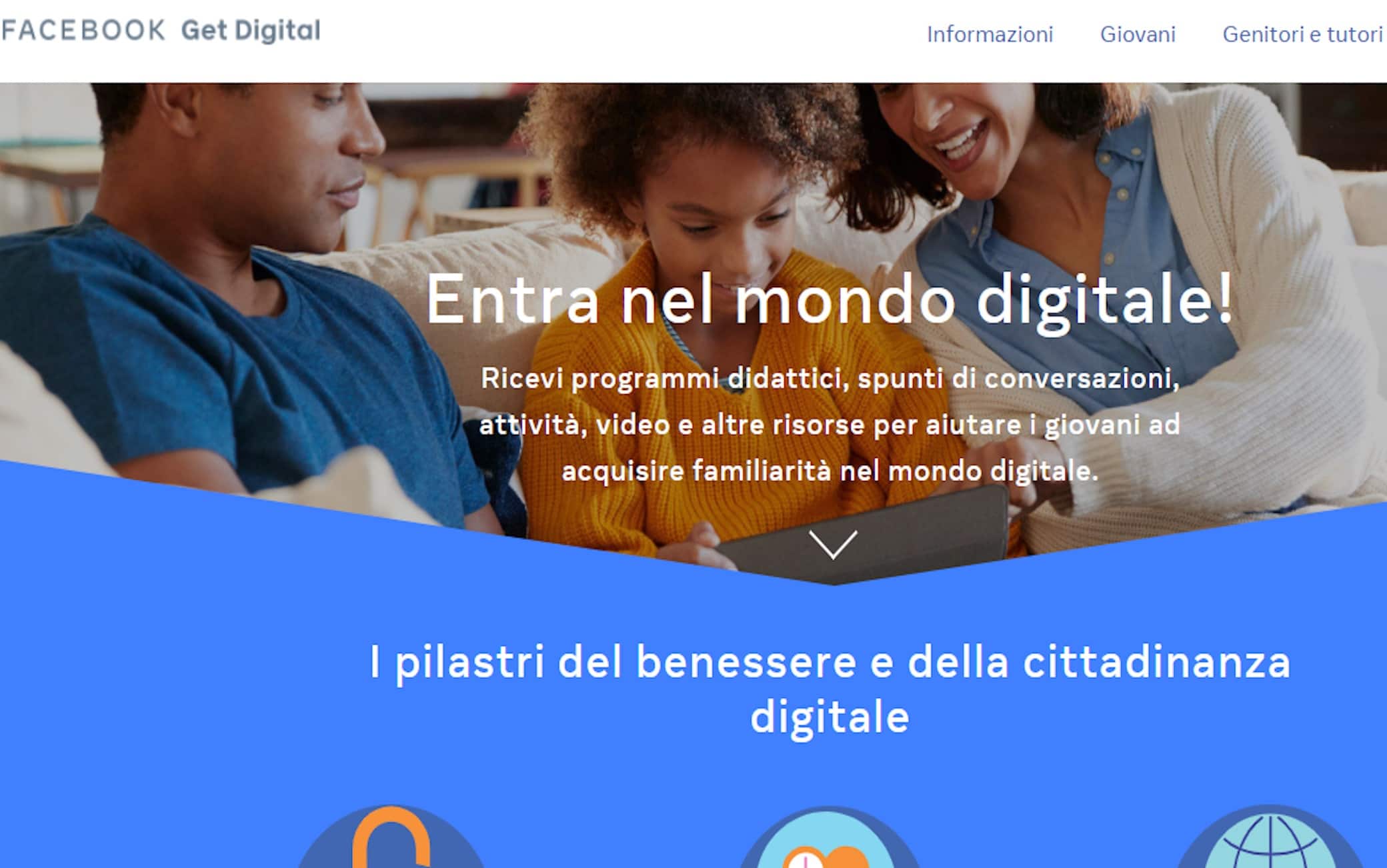 In particolare, i programmi di “GetDigital” si articolano su cinque temi cardine: Le Basi del digitale, Il Benessere, le Interazioni, l’Emancipazione e le Opportunità del Digitale. Tutti sono sviluppati in modo specifico per genitori, insegnanti (a cui sono dedicati corsi pronti per la didattica) e giovani. Si tratta dei fondamenti e delle basi utili per aiutare a costruire competenze e abilità di cui i giovani hanno bisogno, soprattutto oggi, per navigare nel mondo digitale in maniera sicuro. Le risorse sono state sviluppate da Facebook insieme ad esperti internazionali del mondo digitale, che hanno collaborato per fornire strumenti validi, affidabili e supportati dalle più moderne ricerche applicabili a tutte le piattaforme online, non solo a quelle di Facebook. Tra i partner internazionali del progetto, anche le Università di Harvard, di Yale e l'Unesco. Per il lancio italiano, Facebook collabora con la Fondazione Carolina, nata per raccogliere la sfida di Paolo Picchio, il padre di Carolina, una giovane vittima di cyberbullismo che a 14 anni si è tolta la vita dopo aver lasciato un messaggio diventato iconico: “Le parole fanno più male delle botte”. Obiettivo della Onlus, quello di realizzare un futuro in cui la Rete sia un “luogo” sicuro per i bambini e gli adolescenti, riscoprendo il valore delle relazioni autentiche anche sui social.