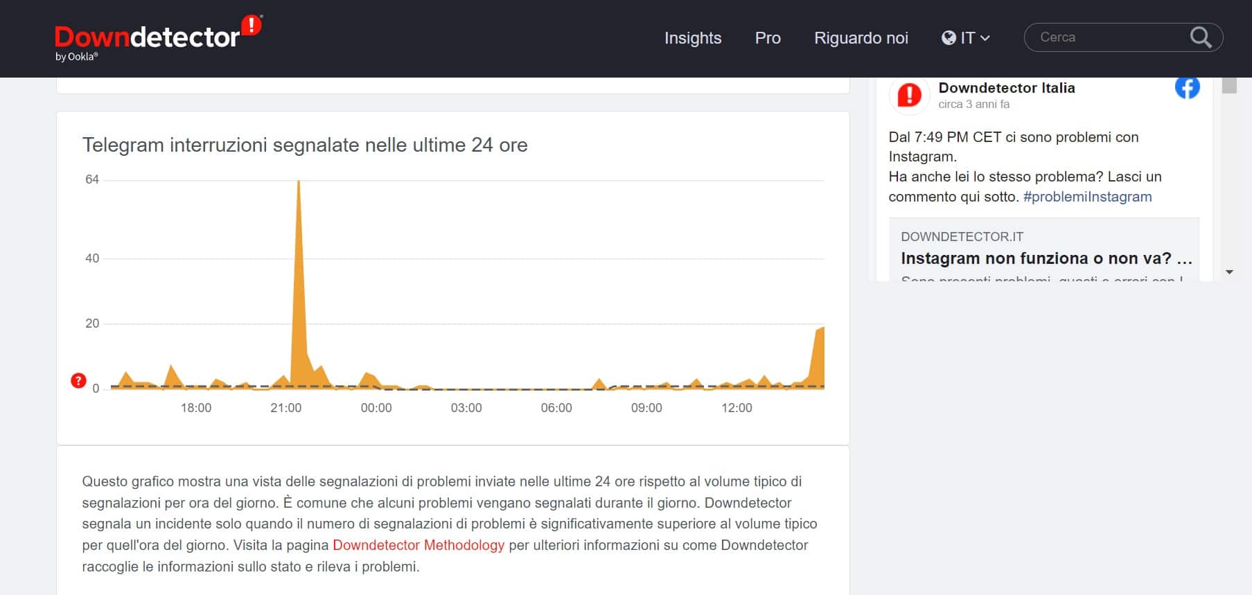 Come segnalato dal sito Downdetector sono state inviate diverse segnalazioni nelle ultime 24 ore rispetto al volume tipico di segnalazioni per ora del giorno