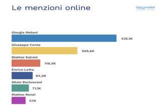 LE MENZIONI – Rilevanti anche le menzioni nei social, che evidenziano quanto gli utenti delle piattaforme parlino di te. Anche qui il risultato più importante lo registra Giorgia Meloni, passata da 89 a 435 mila menzioni nel giro di sei mesi, seguita da Giuseppe Conte, a quota 269 mila. Staccato Matteo Salvini, che si forma a 118 mila menzioni