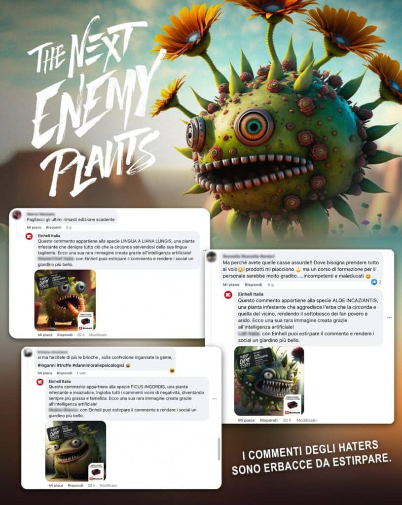 Einhell, brand tedesco di apparecchi wireless per il giardinaggio e il bricolage, ha deciso di sfruttare l’intelligenza AI per combattere gli attacchi degli hater. The Next Enemy Plants è la nuova irriverente campagna, firmata Different, che si pone l’obiettivo di epurare il giardino del web dalle malerbe, grazie all’intelligenza artificiale che riesce a creare l’immagine simbolica dell’abuso online: l’erba cattiva, rappresentata come un’entità malevola che cresce e si diffonde sul web, soffocando la libertà di espressione e minacciando la sicurezza degli utenti. Il Brand ha così creato un’immagine potente e memorabile. E il tono irriverente e scomodo della campagna ha lanciato apertamente una sfida ai leoni da tastiera, invitandoli a smettere di infastidire gli altri utenti.